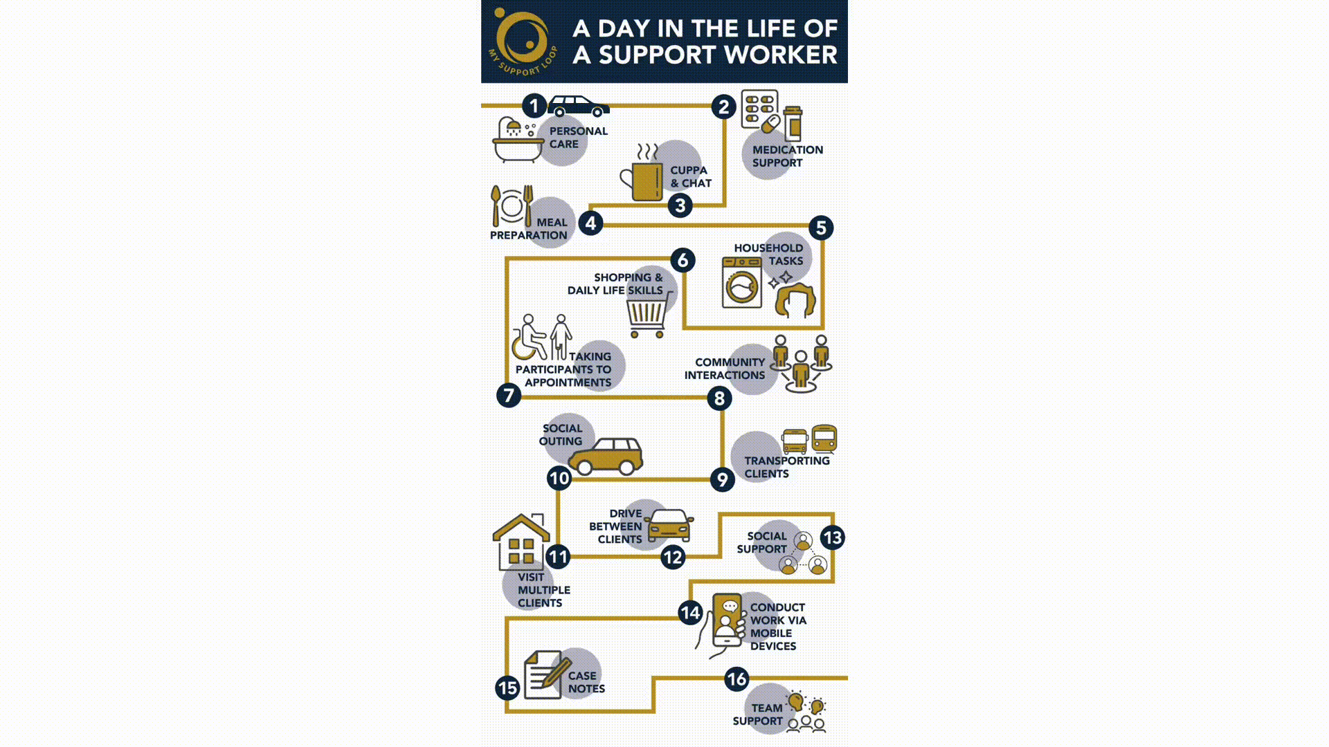 No two days are ever the same for a support worker at My Support Loop. Depending on the needs of our community members, a day might include multiple short shifts supporting different participants or spending quality time providing comprehensive care to one individual.